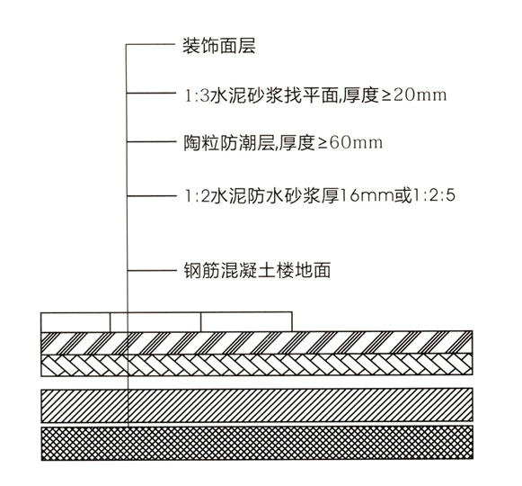 在清洗好的楼地面基层上找素水泥浆一道后,随即抹防水砂浆,或用1:2.5水泥砂浆抹平后再做防潮层。拌制陶粒混凝土前,先用水湿润陶粒,然后再掺入水泥拌合均匀,并严格控制用水量,以不淌浆能包裹陶粒表面为宜,且应随拌随铺。陶粒混凝土防潮层如埋设管道,其管道周围应先用水泥砂浆或细石混凝土固定稳固后再铺设。陶粒铺设后应用木赤分层赶平,木拍拍实,抹平至设计厚度和坡度。陶粒防潮层铺设完成后应注意养护,养护期间严禁在表面上行走、操作、拖拉工具杂物等,并待期强度达到70%或至少三天后方可进行下一道工序施工。